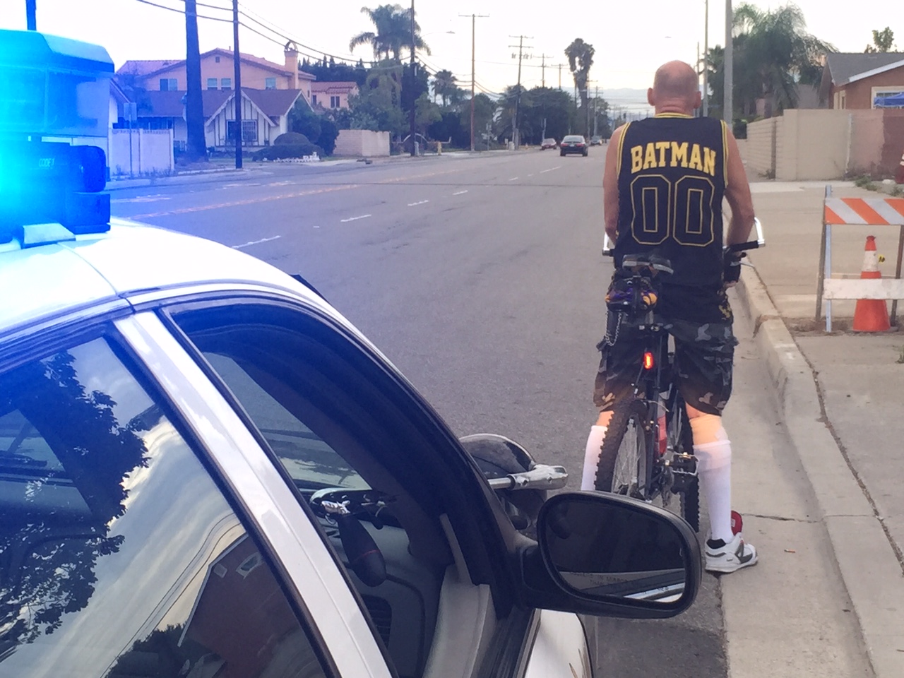 What really caught my eye was the word BATMAN on the back of his tank top. As I passed him, I thought it would be a funny picture to make it look like the police stopped Batman.